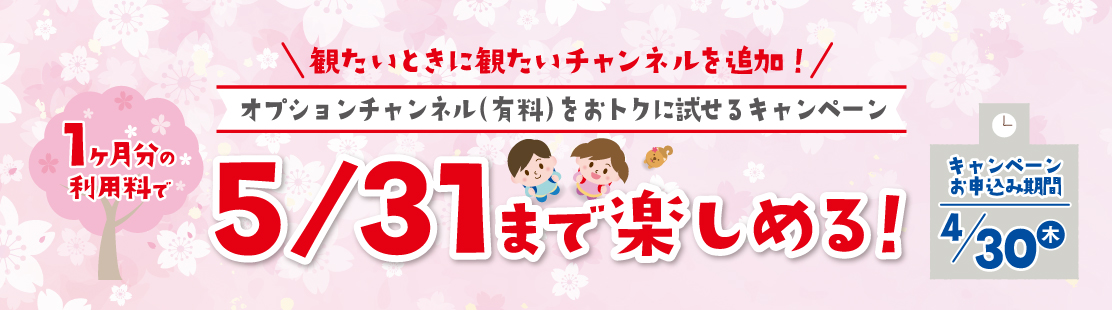 ※キャンペーン視聴期間終了(5月31日)の前日までに解約のご連絡がない場合は自動契約更新となり、6月より継続視聴(通常月額利用料)となります。