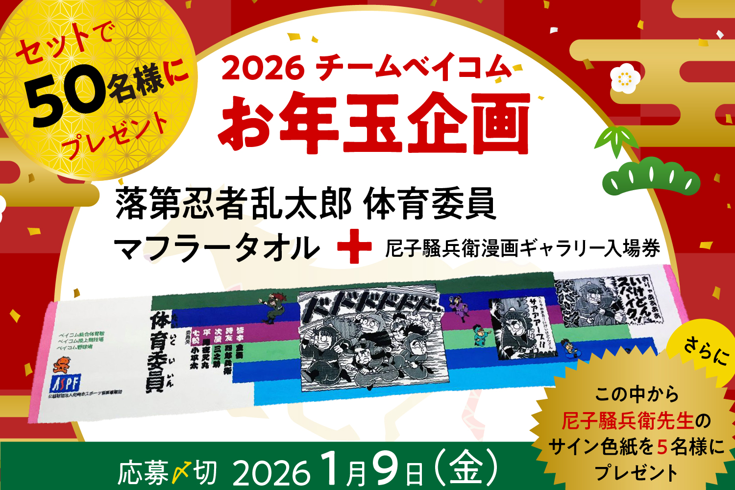 【新春!豪華お年玉企画】落第忍者乱太郎 体育委員 マフラータオル & 尼子騒兵衛漫画ギャラリー 入場券セットで50名様にプレゼント!