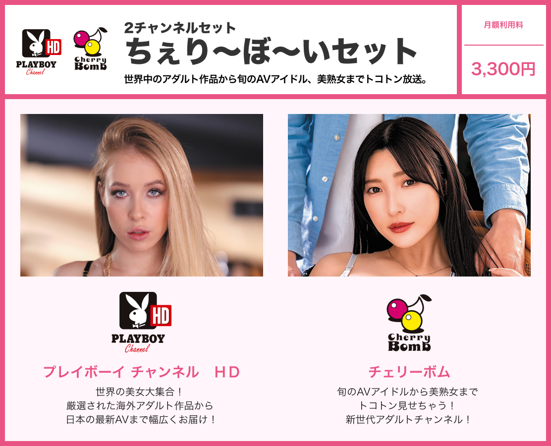 ※「プレイボーイ チャンネル HD」「チェリーボム」のいずれかにご加入のお客様が1月中に「ちぇり~ぼ~いセット」に変更された場合、「プレイボーイ チャンネル HD」「チェリーボム」の1月分の月額利用料は必要となります。